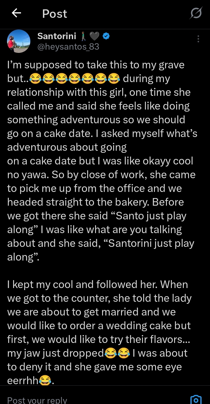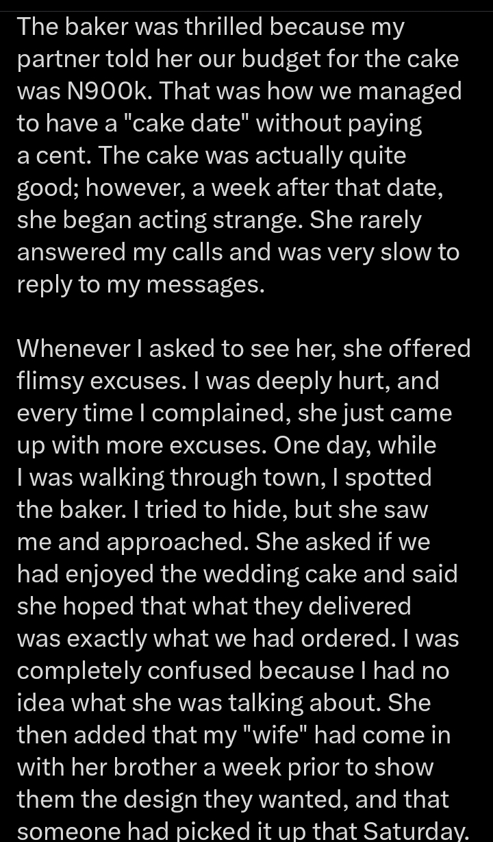 A man’s post detailing how he got heartbroken by his ex-girlfriend after a cake date has gone viral online.