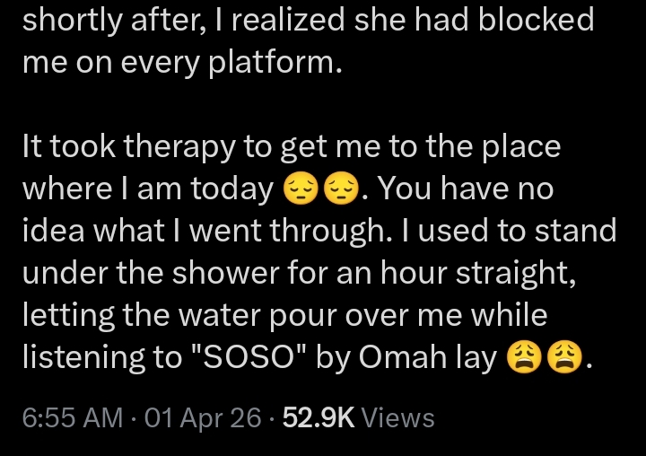 Sharing the emotional aftermath of the heartbreaking discovery, the X user tweeted, “Took therapy to get me to the place where I am today 😔😔. You have no idea what I went through. I used to stand under the shower for an hour straight, letting the water pour over me”.