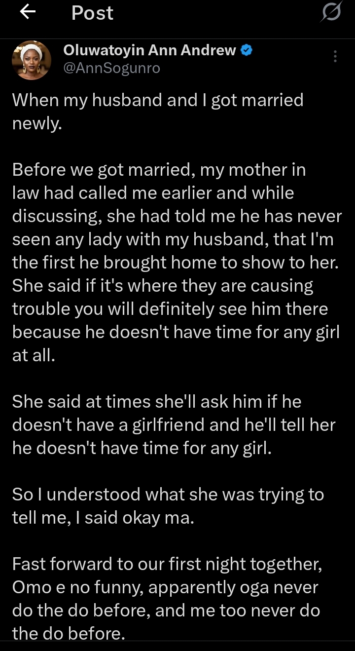 The woman, identified as @AnnSogunro on X (formerly Twitter), disclosed that her husband had no prior intimacy before their first night.