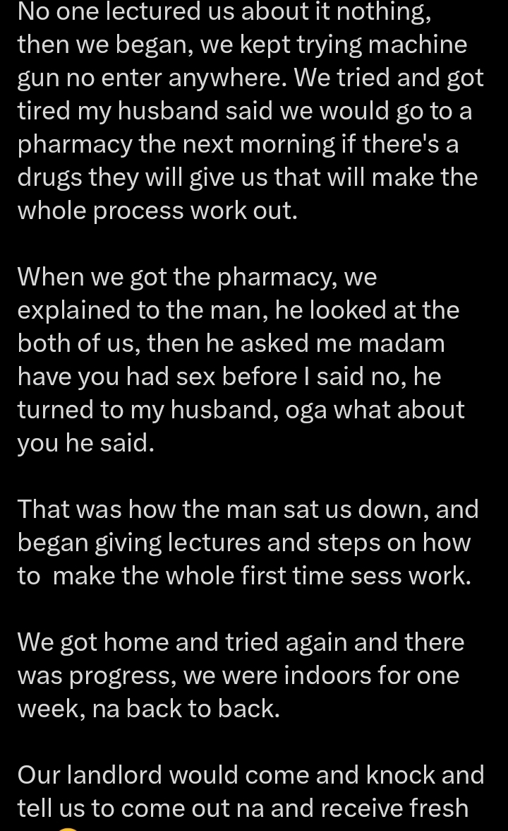 Recounting what what transpired at the pharmacy, @AnnSogunro narrated, “He looked at the both of us, then he asked me madam have you had sex before I said no, he turned to my husband, oga what about you he said. That was how the man sat us down, and began giving lectures and steps”.