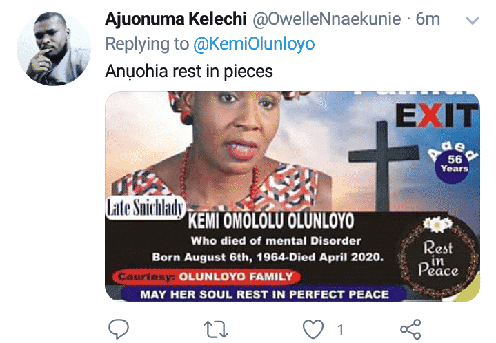 An IPOB loyalist has taken to twitter to showoff comic obituary picture he designed for Kemi Olunloyo after she alleged that Nnamdi Kanu is dead.