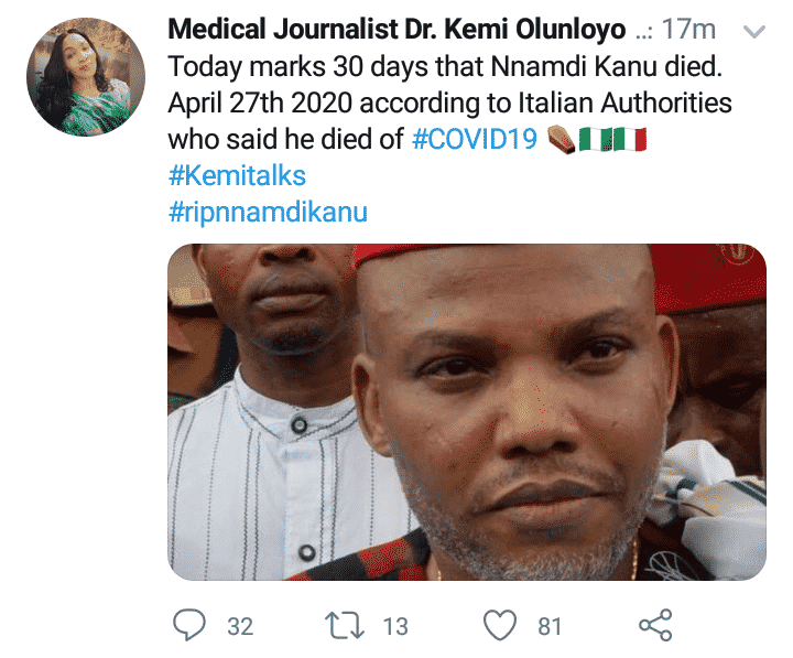 It all started when Nigerian self styled investigative journalist took to her Twitter page to allege that today marks 30 days since the leader of the Indigenous People of Biafra died.