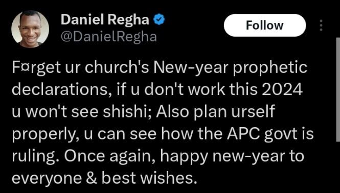 He wrote: “Forget ur church’s New-year prophetic declarations, if u don’t work this 2024 u won’t see shishi; Also plan urself properly, u can see how the APC govt is ruling. Once again, happy new-year to everyone & best wishes.”