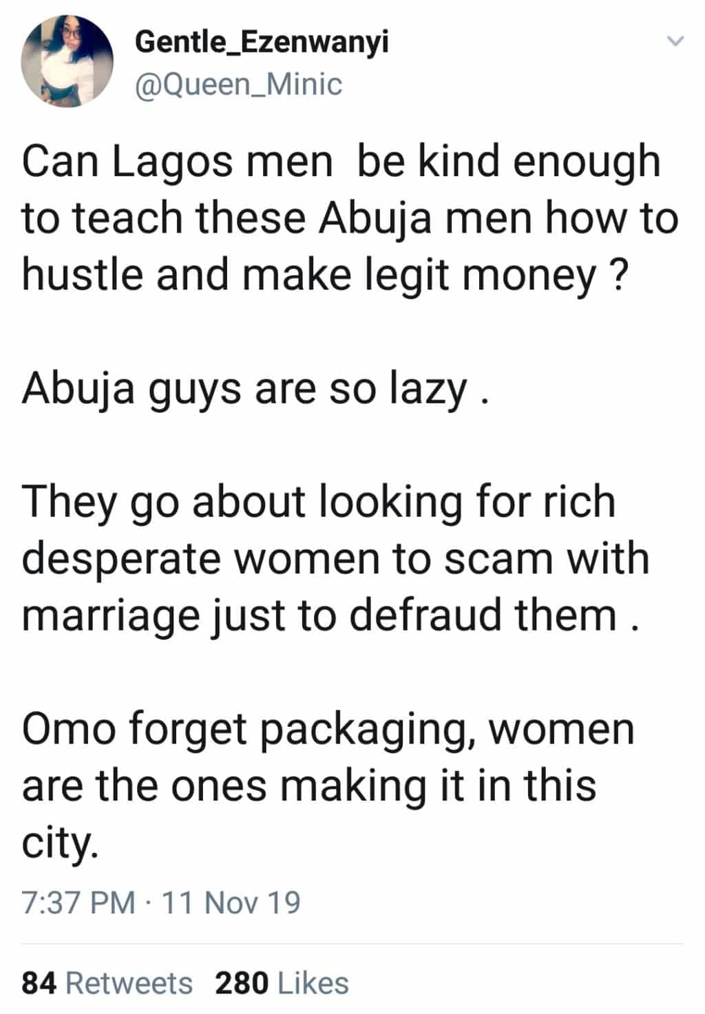 “Can Lagos men be kind enough to teach these Abuja men how to hustle and make legit money? Abuja guys are so lazy. They go about looking for rich desperate women to scam with marriage just to defraud them. Omo forget packaging, women are the ones making it in this city”.