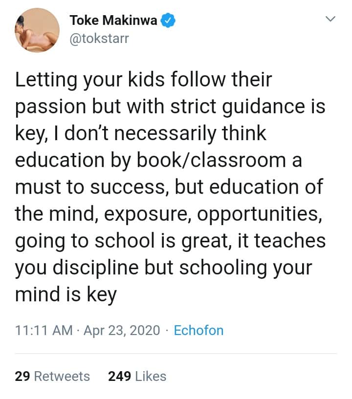 Toke Makinwa further stated that she doesn’t feel that formal education is a must to success, but other forms of education.