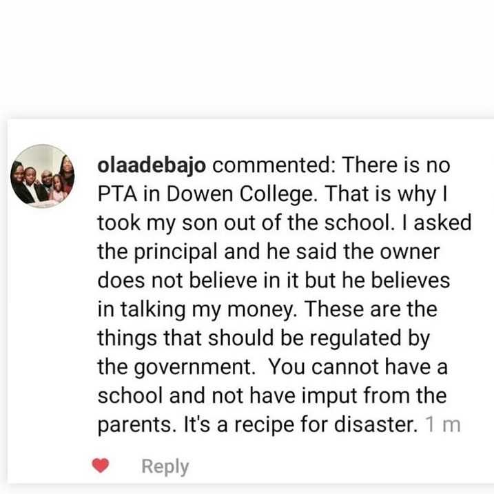 Ola Oladebajo, who is reportedly a former parent at Dowen college has revealed why his child was taken out of the school.