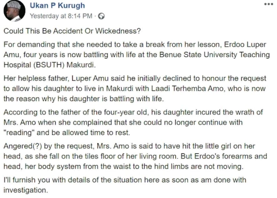 “Could This Be Accident Or Wickedness? For demanding that she needed to take a break from her lesson, Erdoo Luper Amu, four years is now battling with life at the Benue State University Teaching Hospital (BSUTH) Makurdi.