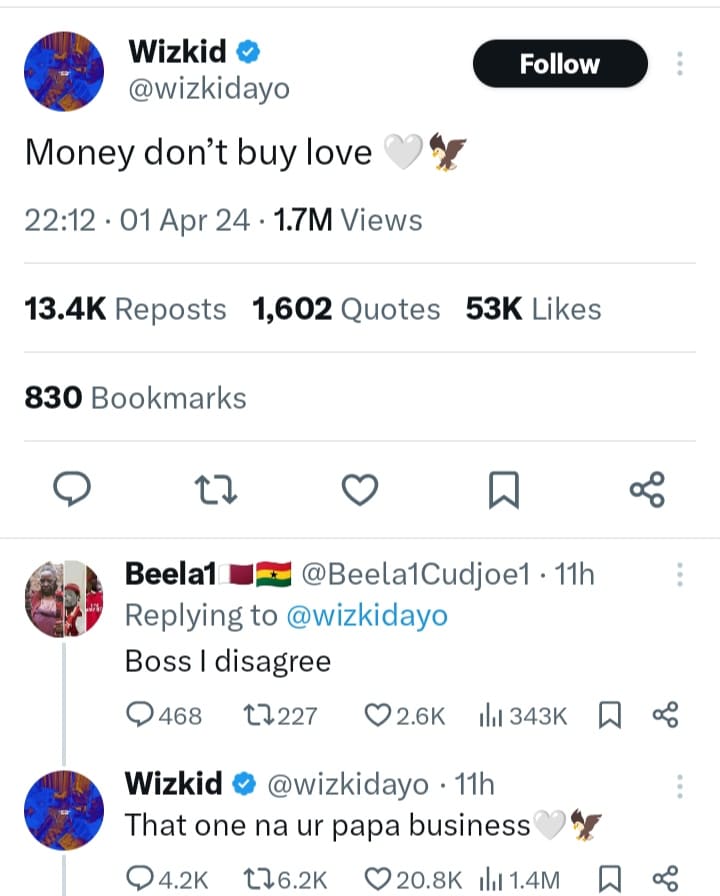 Netizens react as musician, Wizkid replies fan who disagreed with him after he said that money doesn’t buy love.