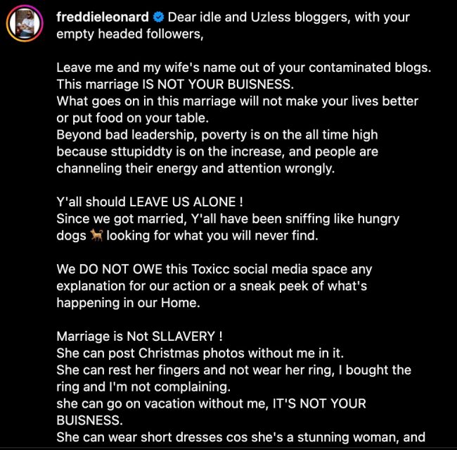 In a detailed post shared on his Instagram page, Leonard called out bloggers spreading false rumours about their relationship, urging them to respect their privacy.