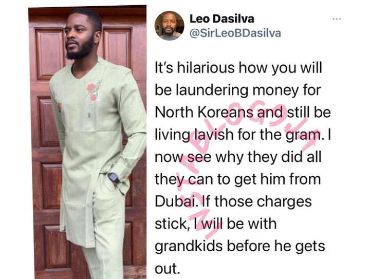 Leo reacting to the news tweeted; “It’s hilarious how you will be laundering money for North Koreans and still be living lavish for the gram. I now see why they did all they can to get him from Dubai. If those charges stick, I will be with grandkids before he gets out”.