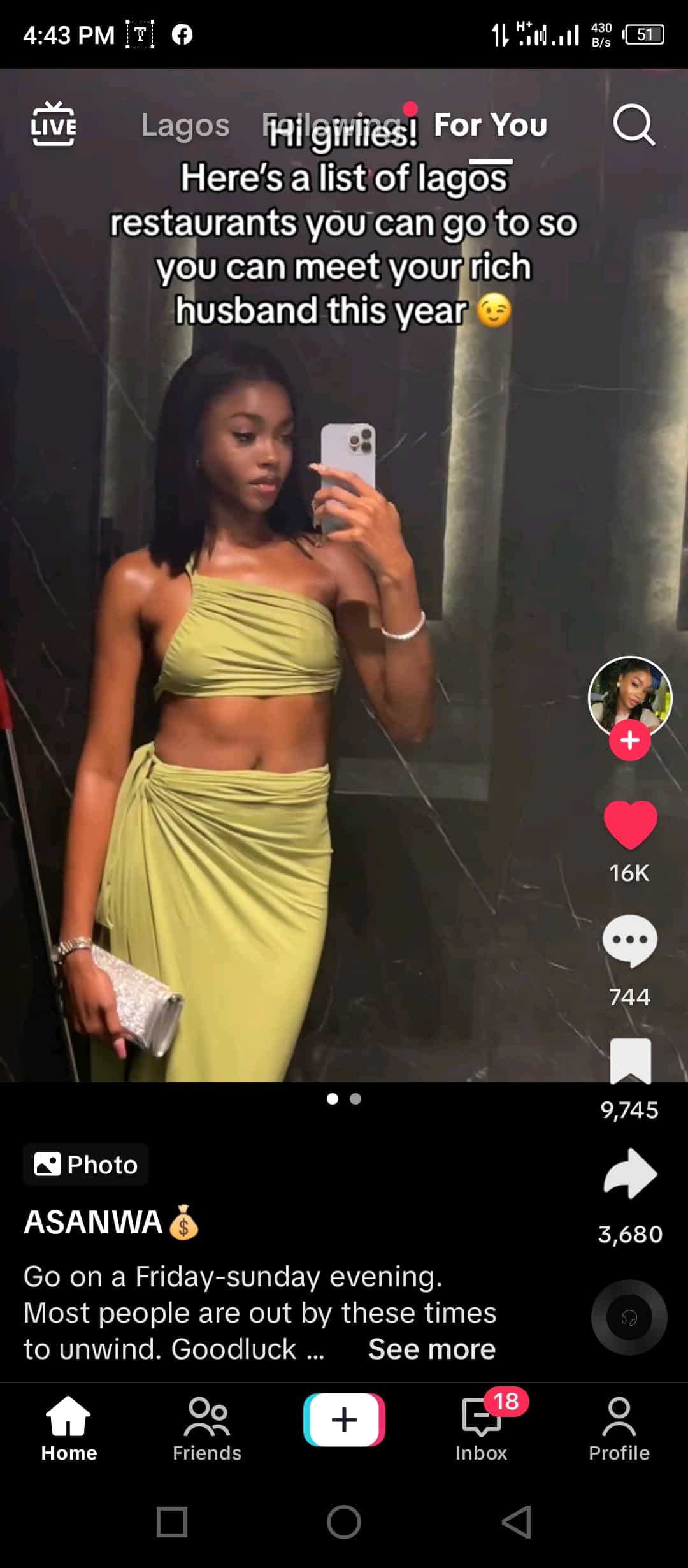 In the post, the face of the beautiful lady was revealed, after which she listed 32 restaurants she knows in Lagos State where single and broke Nigerian girls or ladies can find a rich boyfriend or husband.