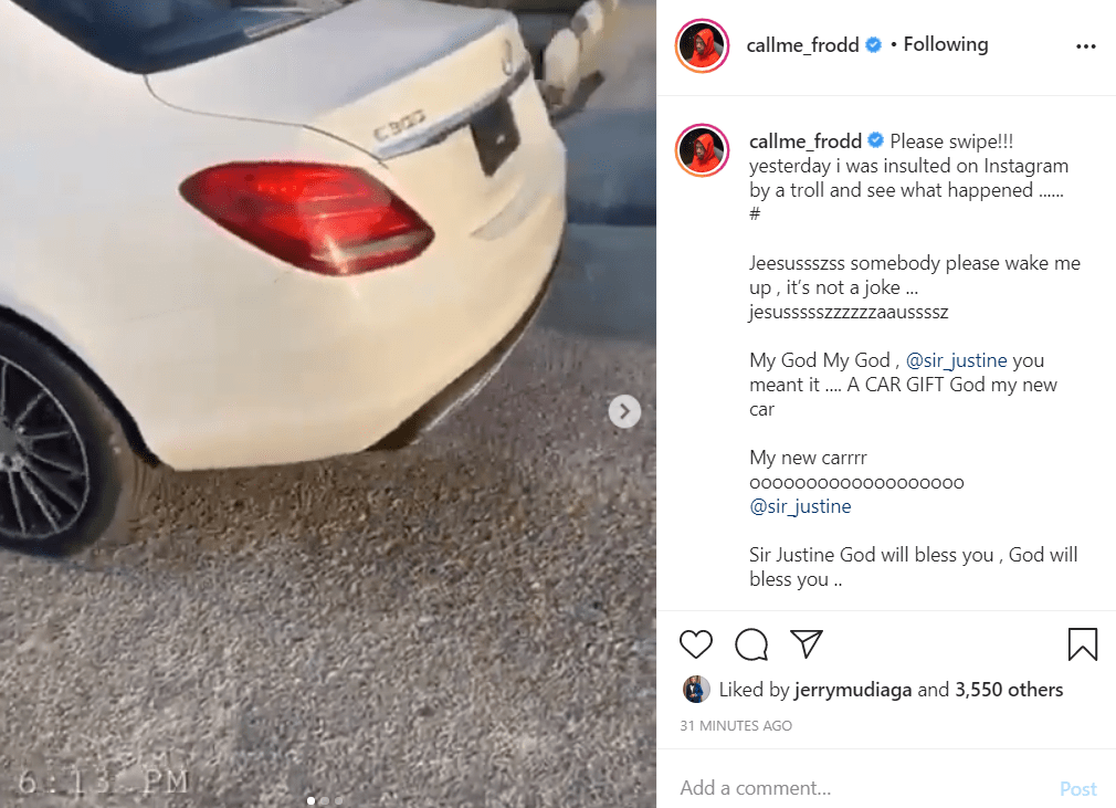 A troll comment by an Instagram user has made former big brother Naija 2019 housemate, Frodd, a car owner.