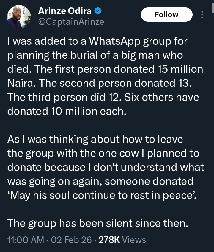 “I was added to a WhatsApp group for planning the burial of a big man who died,” he wrote. “The first person donated ₦15 million. The second person donated ₦13 million. The third person donated ₦12 million. Six others donated ₦10 million each.”