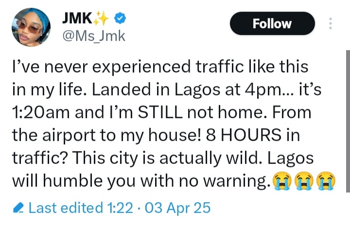The reality star, JMK revealed that she had just arrived Lagos and to get to her house from the airport was a long, slow journey.