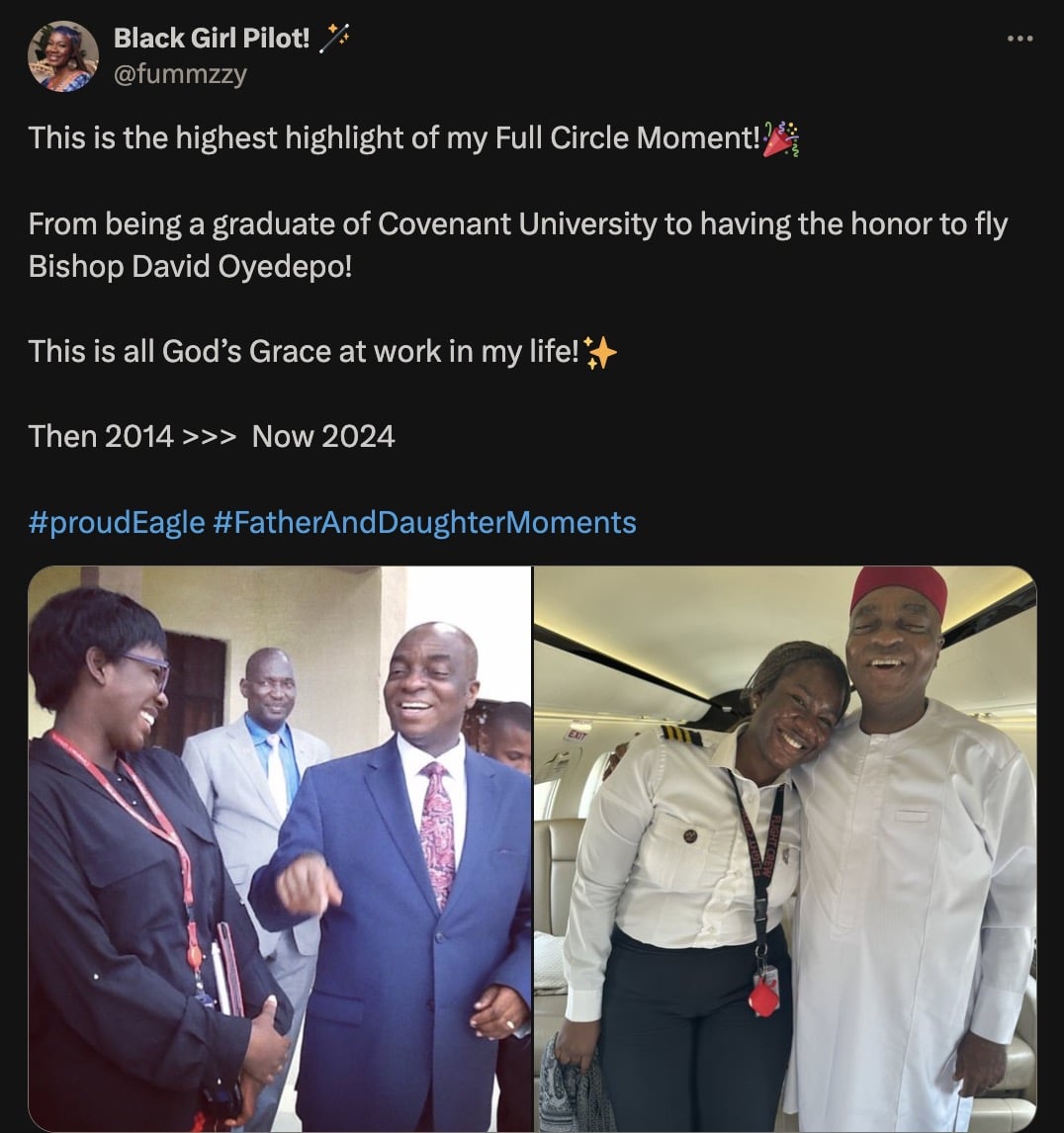 “This is the highest highlight of my Full Circle Moment!🎉. From being a graduate of Covenant University to having the honor to fly Bishop David Oyedepo! This is all God’s Grace at work in my life!✨. Then 2014 >>> Now 2024,” she wrote.