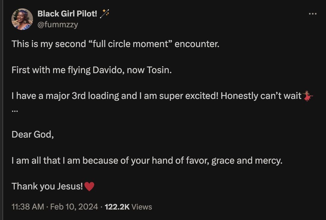 She added, “This is my second “full circle moment” encounter. First with me flying Davido, now Tosin. I have a major 3rd loading and I am super excited! Honestly can’t wait💃🏾 … Dear God, I am all that I am because of your hand of favor, grace and mercy. Thank you Jesus!♥️”