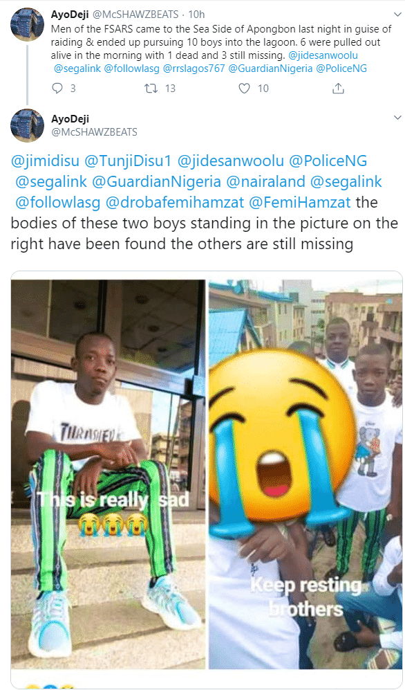 “Men of the FSARS came to the Sea Side of Apongbon last night in guise of raiding & ended up pursuing 10 boys into the lagoon. 6 were pulled out alive in the morning with 1 dead and 3 still missing.”
