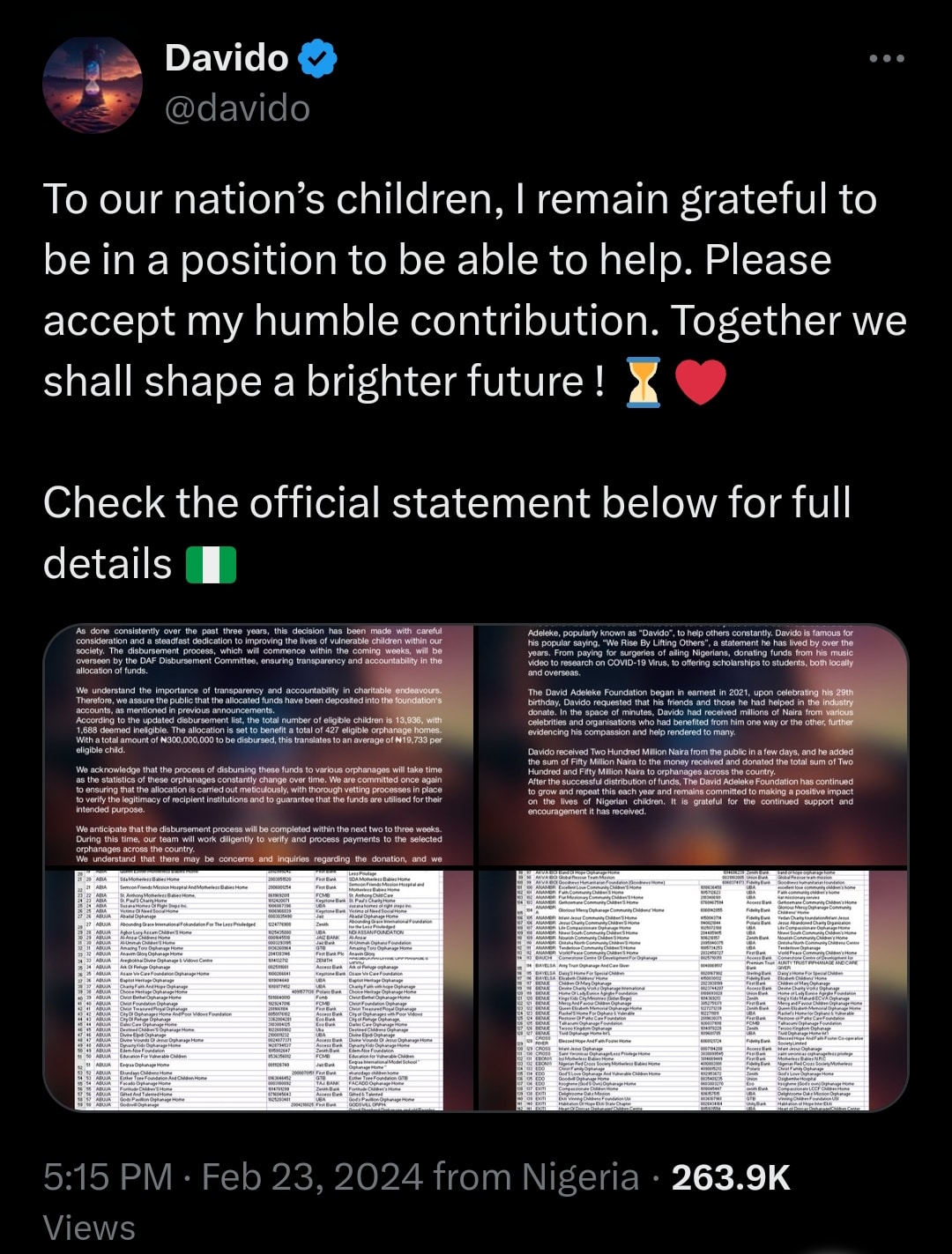 Nigerian singer, songwriter, and record producer David Adedeji Adeleke, known professionally as Davido, has shared a list of 427 verified orphanage homes set to receive his 300 million donations.