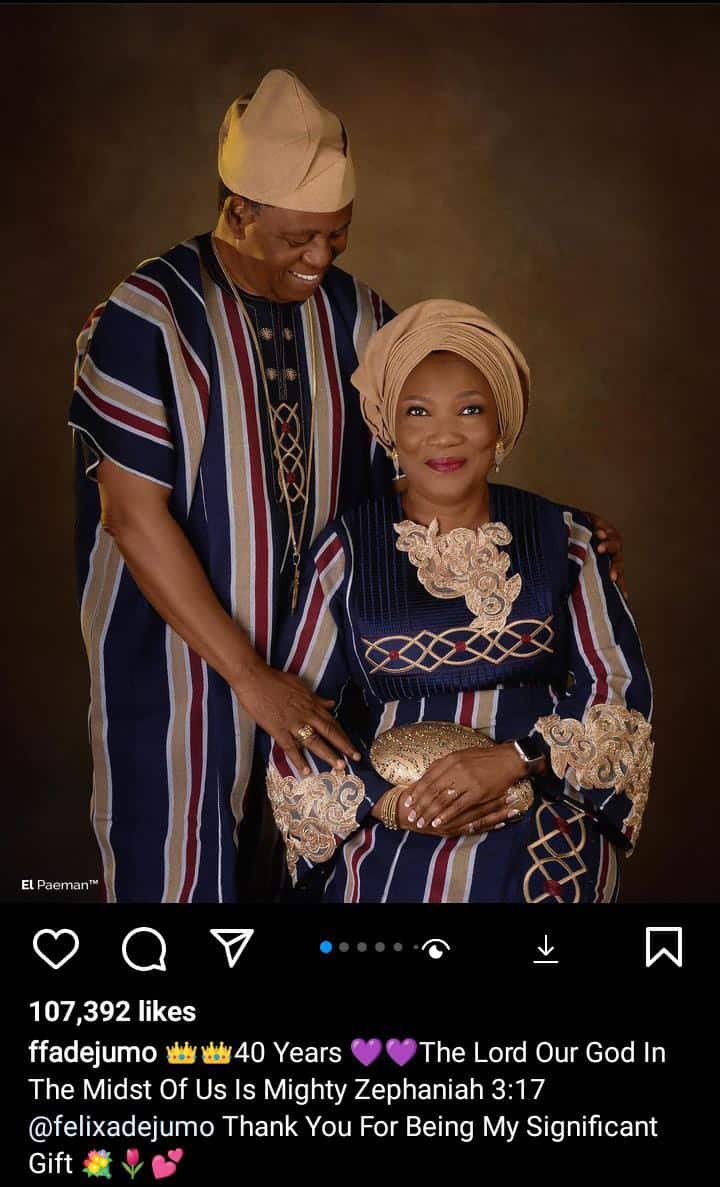 He wrote: “40 Years Still Counting. What An Amazing Journey With The Love Of My Life @ffadejumo. Funke You Are An Exceptional Friend, Wife And Co-labourer. Life Is Simply Exciting With You. Our Future Together Will Remain Glorious In Jesus Name 😇😇😇”