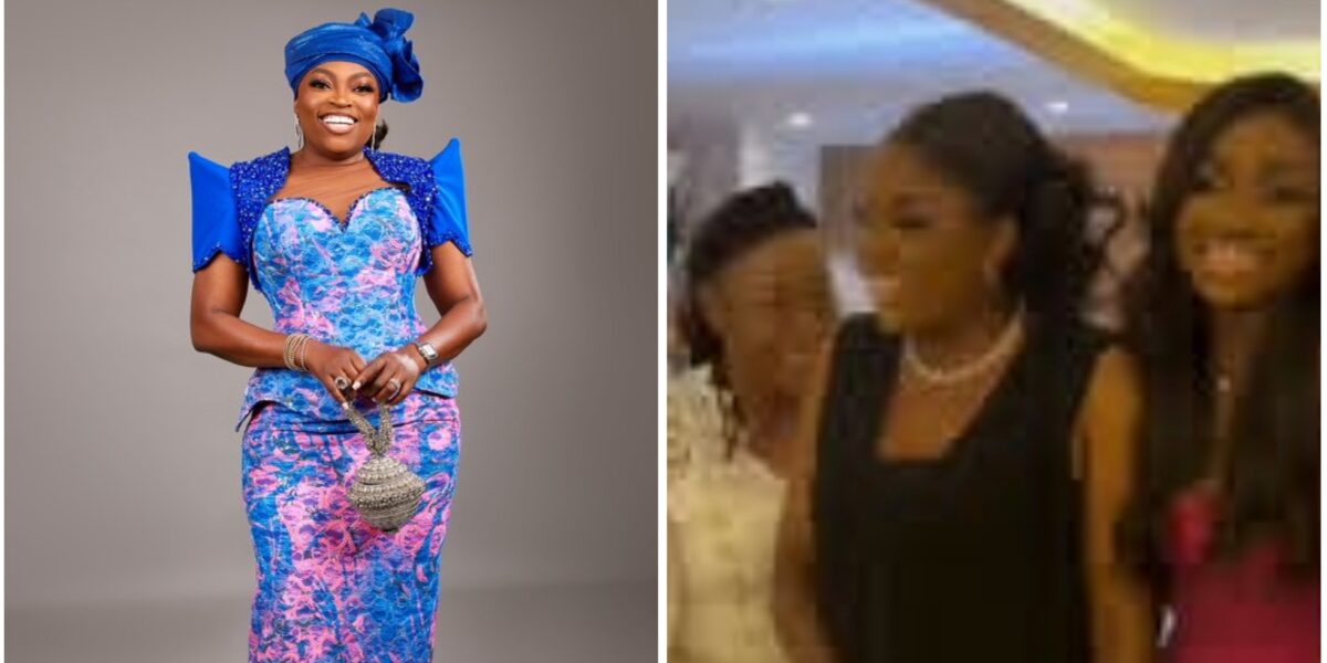 The video shows Funke Akindele engaging in a lively conversation with her crew, surrounded by prominent Nollywood personalities, adding a touch of glamour.