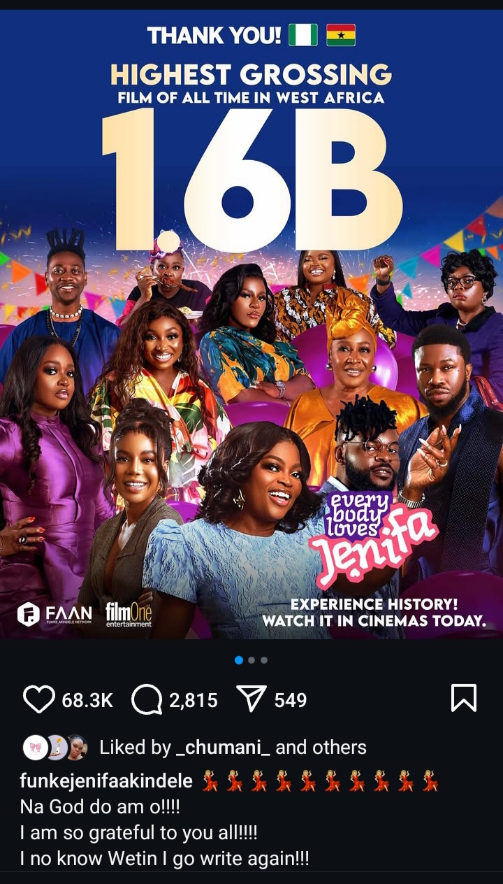 “A billy gang, we’re up! Everybody Loves Jenifa has grossed over ₦1.6 billion at the box office! We can’t thank you enough for showing this movie all your love”