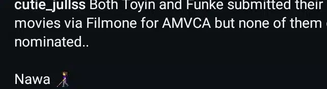 The post reads, “Both Toyin and Funke submitted their movies via Filmore for AMCVA, but none of them got nominated”.