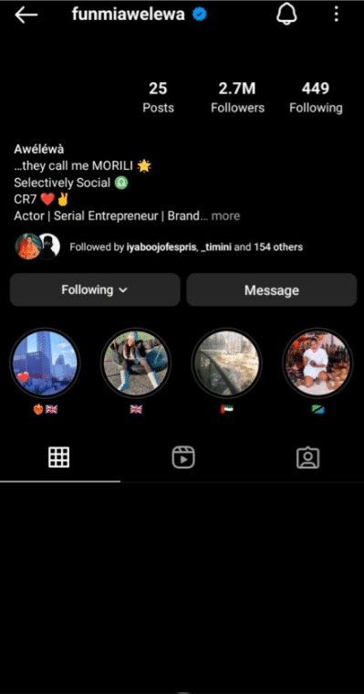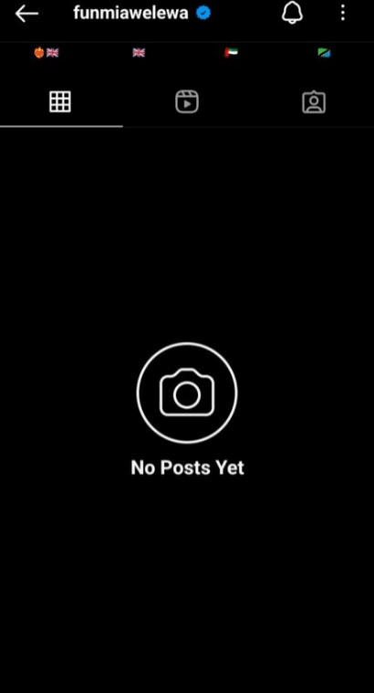 Funmi Awelewa, who portrayed Sisi Quadri’s on-screen spouse in various local series, took the poignant step of clearing her Instagram page of all images and replacing her profile photo with a dark image.