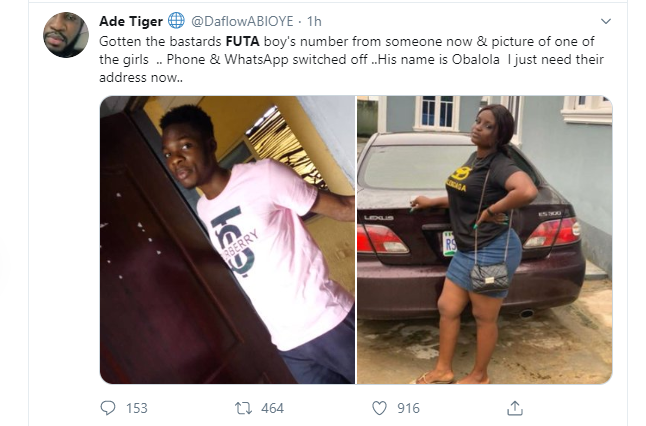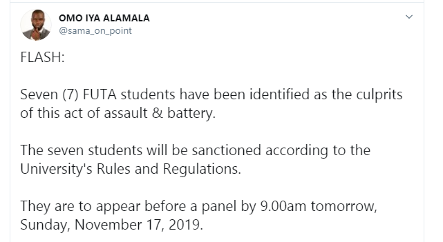 The male student spotted leading the fight in the video has been identified as Obalola, a 300 Level student of Industrial Design. One of the female assaulters has been identified as Oluwadare Faith, a 200 Level student of Food Science Technology. The other has been identified as Bimpe, her department and level was not immediately available.