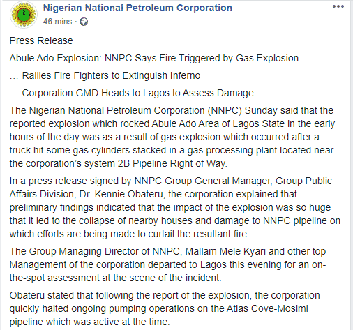 Obateru stated that following the report of the explosion, the corporation quickly halted ongoing pumping operations on the Atlas Cove-Mosimi pipeline which was active at the time.