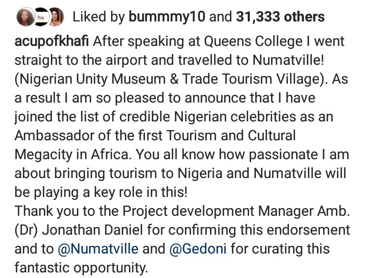 “After speaking at Queens College I went straight to the airport and travelled to Numatville! (Nigerian Unity Museum & Trade Tourism Village). As a result I am so pleased to announce that I have joined the list of credible Nigerian celebrities as an Ambassador of the first Tourism and Cultural Megacity in Africa. You all know how passionate I am about bringing tourism to Nigeria and Numatville will be playing a key role in this!
