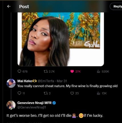 “It gets worse bro. I’ll get so old I’ll die🤷🏾♀️. 😊if I’m lucky”, Genevieve Nnaji also responded.