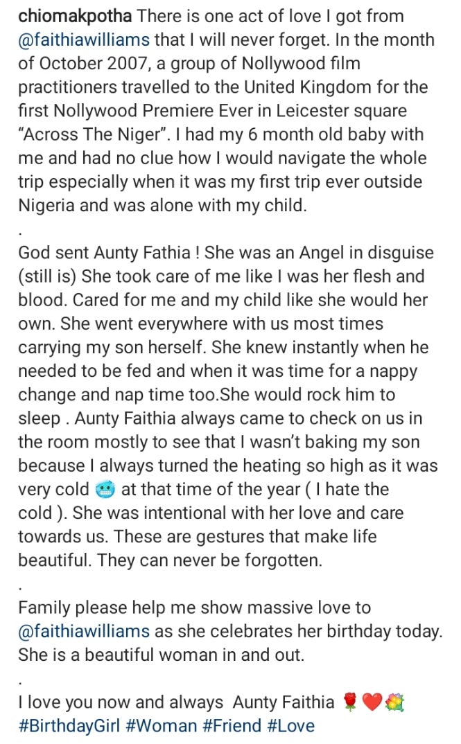 In celebration of Faithia Williams’ 55th birthday on Monday, Chioma Akpotha penned a lengthy note, recounting her encounter with the actress.