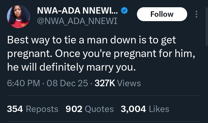 She wrote: “Best way to tie a man down is to get pregnant. Once you’re pregnant for him, he will definitely marry you.”