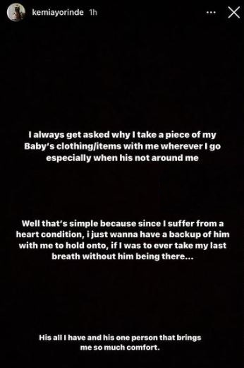 Kemi had taken to her Instastory page to note that at any moment, she has always kept the clothing of her son with her even when he’s nowhere around her.