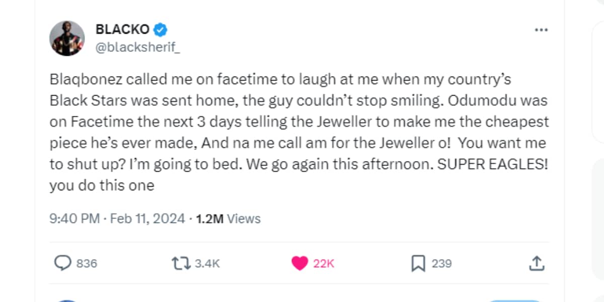 “Blaqbonez called me on Facetime to laugh at me when my country’s Black Stars was sent home, the guy couldn’t stop smiling. Odumodu was on Facetime the next 3 days telling the Jeweller to make me the cheapest piece he’s ever made, And na me call am for the Jeweller o! You want me to shut up? I’m going to bed. We go again this afternoon. Super Eagles! you do this one.”