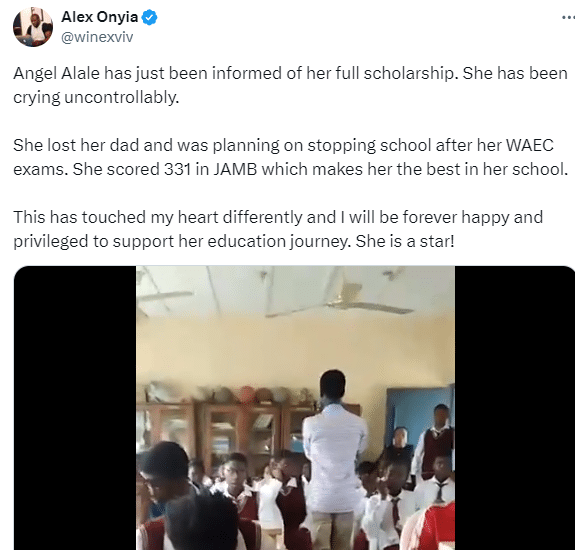 “Angel Alale has just been informed of her full scholarship. She has been crying uncontrollably. “She lost her dad and was planning on stopping school after her WAEC exams. She scored 331 in JAMB which makes her the best in her school. “This has touched my heart differently and I will be forever happy and privileged to support her education journey. She is a star!”