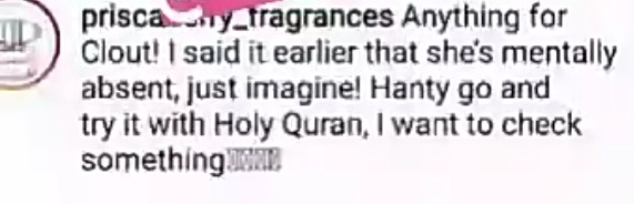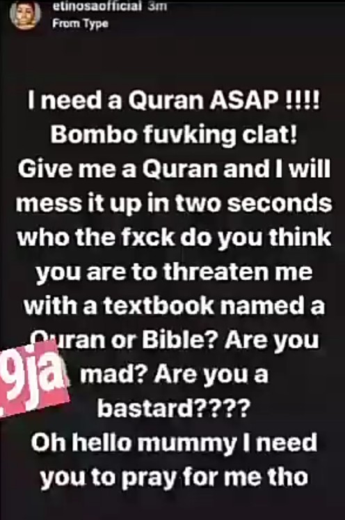 Reacting to this, Etinosa demanded for a Quran ASAP, insisting that she would mess it up within the next two seconds, as no one has the right to threaten her with a ‘textbook’ called Quran or Bible.