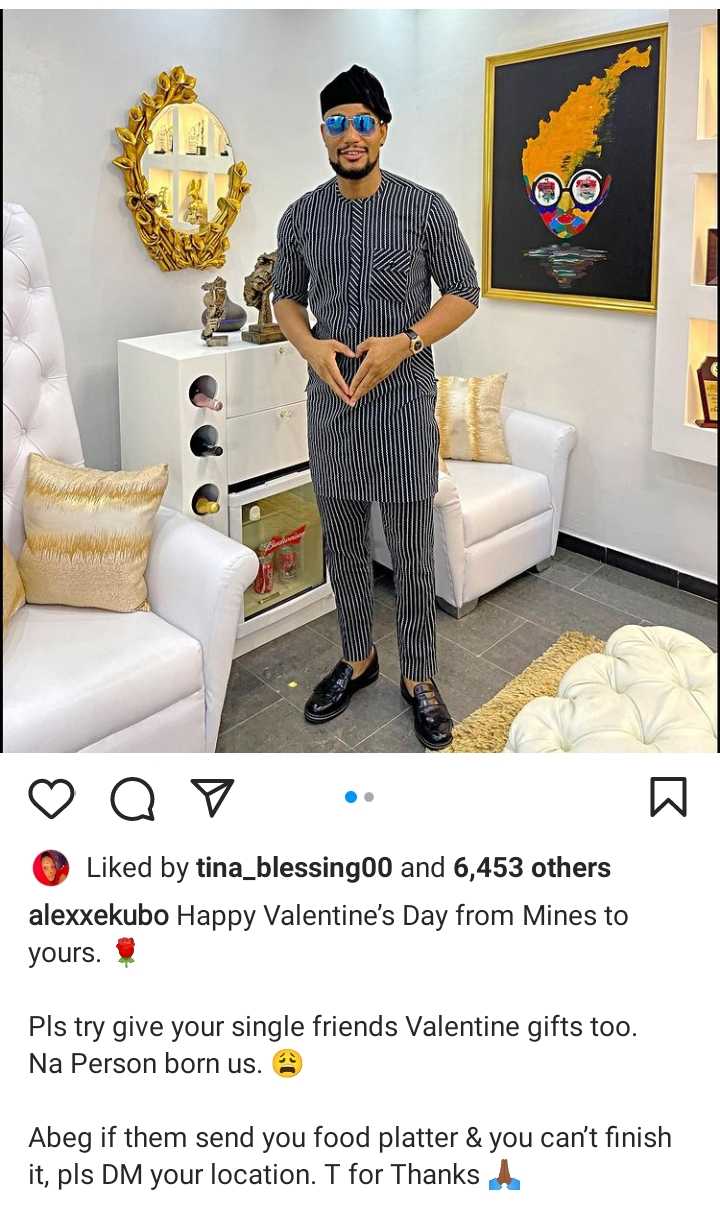 Popular Nollywood actor and socialite, Alex Ekubo has taken to his social media page to lament, and throw in a subtle hint that he’s single again, as he asks friends to give gifts to the singles too.