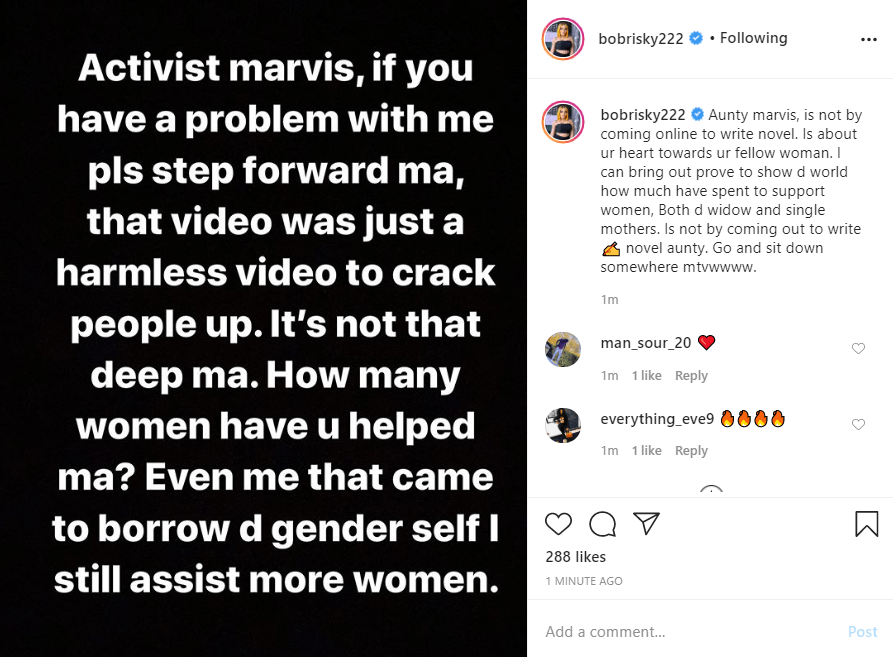 Bobrisky in an Instagram post, told Mavis that he can prove to the world that he supports women, both single mothers and widows, and not just write things online.