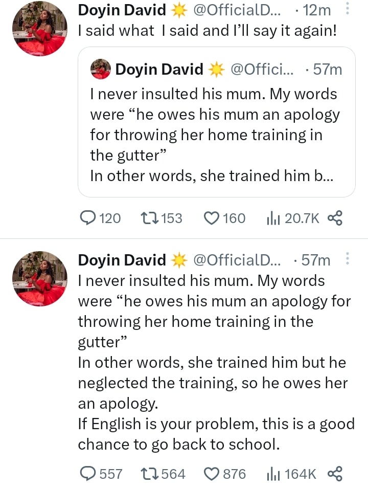 Reacting to this backlash, Doyin clarified that she hadn’t insulted his mother but had meant that Adekunle there his mother’s training to the gutter.