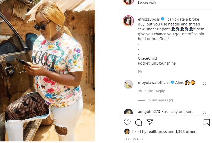 “I can’t date a broke guy, but you use needle and thread sew under ur pant ??♀️??♀️??♀️??♀️if dem give you chance you go use office pin hold ur bra. Goat!” she wrote on Instagram.