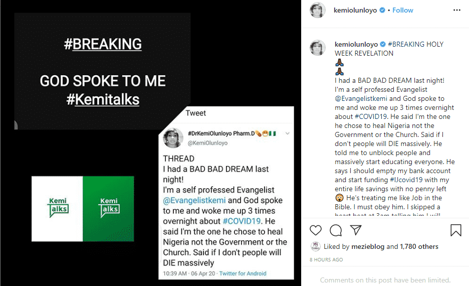 “#BREAKING HOLY WEEK REVELATION???? I had a BAD BAD DREAM last night! I’m a self professed Evangelist @Evangelistkemi and God spoke to me and woke me up 3 times overnight about #COVID19. He said I’m the one he chose to heal Nigeria not the Government or the Church. Said if I don’t people will DIE massively.