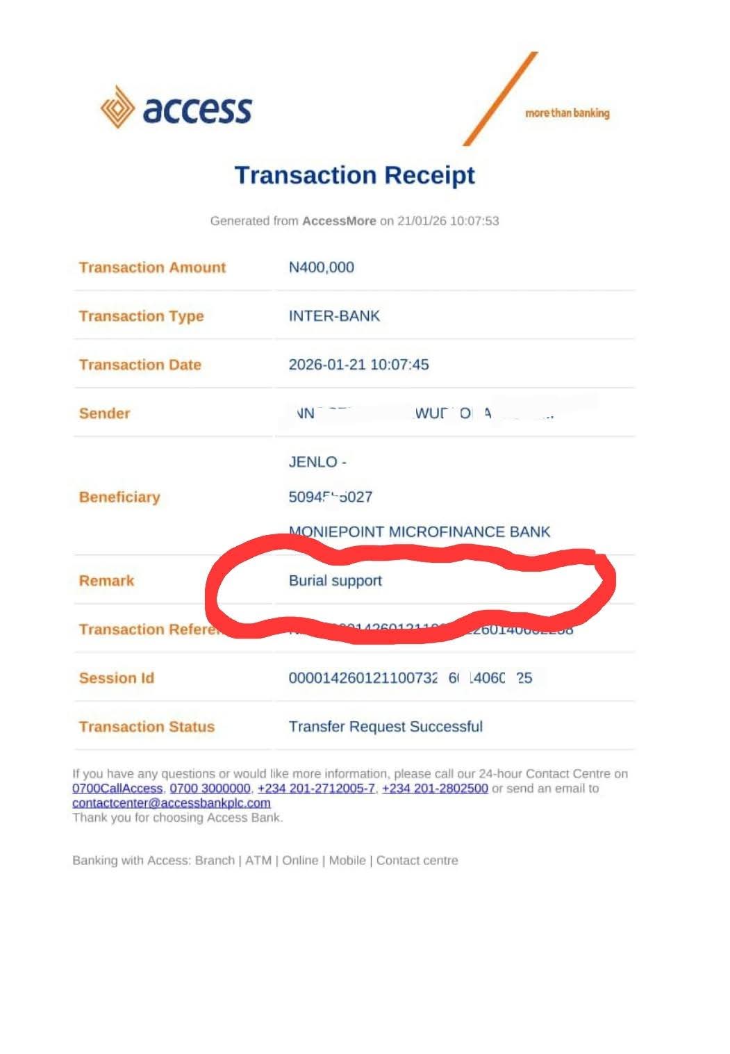 According to her, the sender wrote burial support as the purpose of the transfer.
