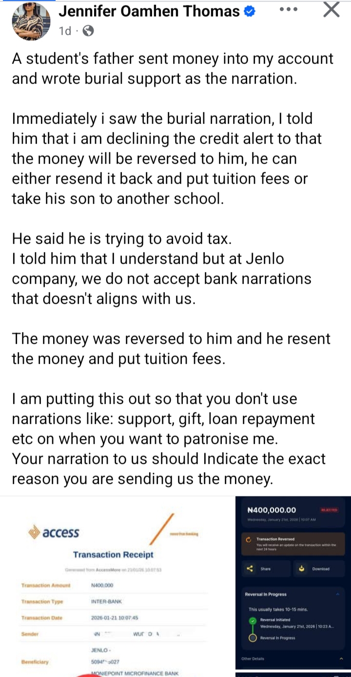 A Lagos-based bag designer, Jennifer Oamhen Thomas, has narrated how she rejected a N400,000 transfer sent by a student’s father because of the narration attached to the transaction.
