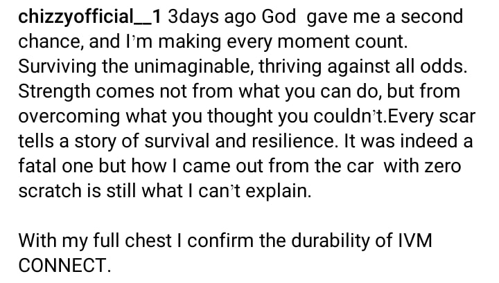 “God gave me a second chance” – Chizzy breaks silence after surviving a ghastly accident