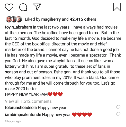 Celebrating her triumphant entry into the new year, actress and new mum, Toyin Abraham has penned down an appreciation message to God for making 2019 an awesome year for her!