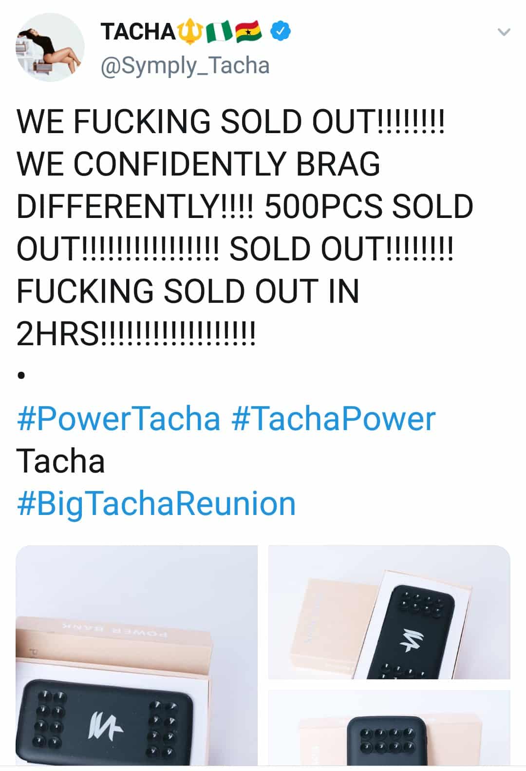 Controversial star, Natacha Akide aka Tacha has shown her appreciation to God after she sold off 500 pieces of ‘PowerTacha’, her power bank brand, in 2 hours.