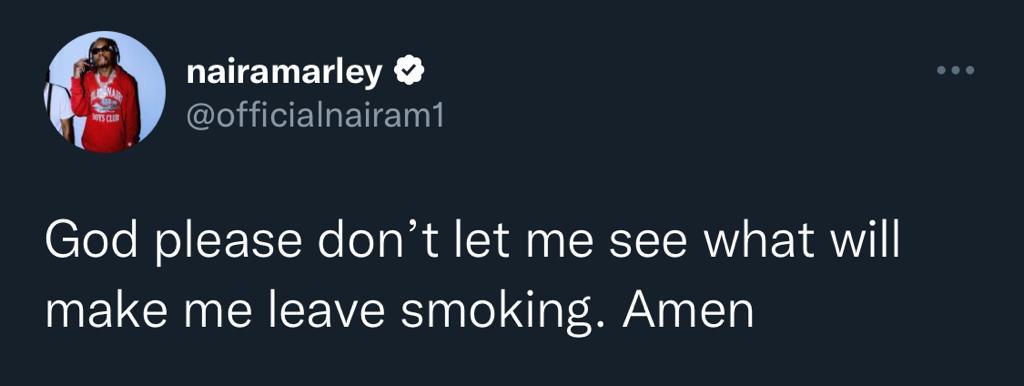 Naira took to the micro-blogging platform, Twitter, where he made a controversial statement. In his Tweet, he prayed to his maker never to “let me see what will make me leave smoking.”