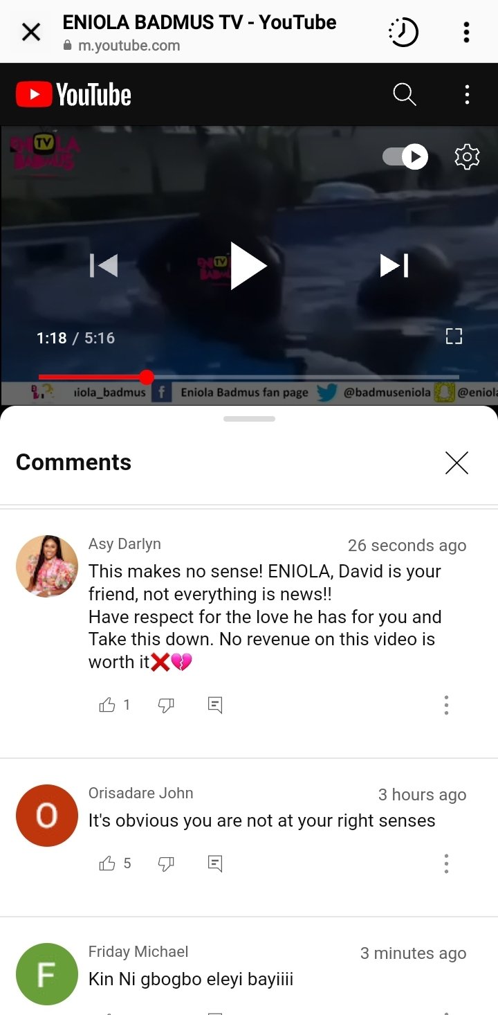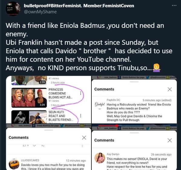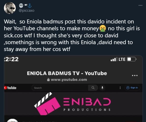 “Wait, so Eniola badmus post this davido incident on her YouTube channels to make money🤮 no this girl is sick.cos wtf I thought she’s very close to david ,somethings is wrong with this Eniola ,david need to stay away from her cos wtf,” a Twitter user wrote.