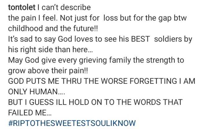 “I can’t describe the pain I feel. Not just for loss but for the gap btw childhood and the future!! It’s sad to say God loves to see his BEST soldiers by his right side than here…